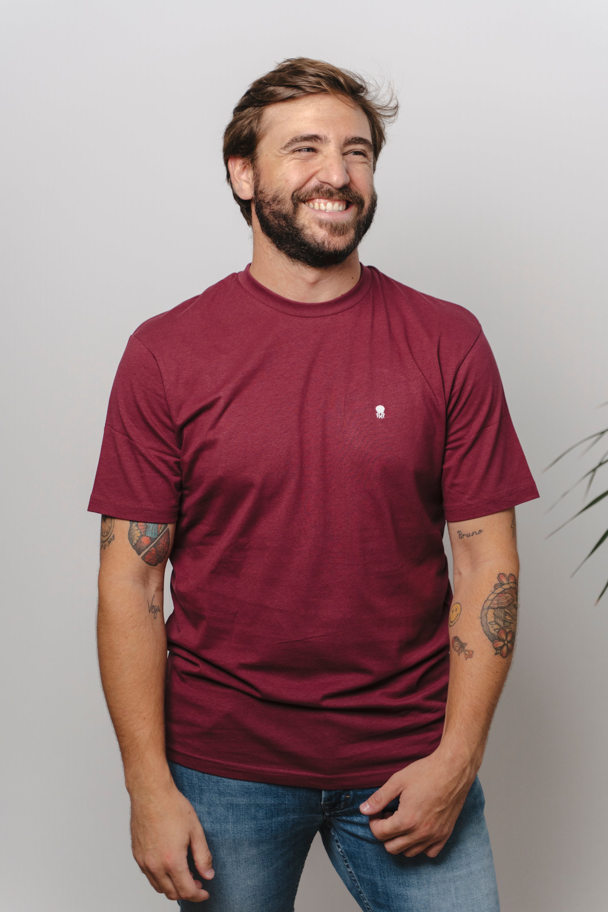 CAMISETA BURDEOS CON CUELLO REDONDO Y BORDADO MEDUSA