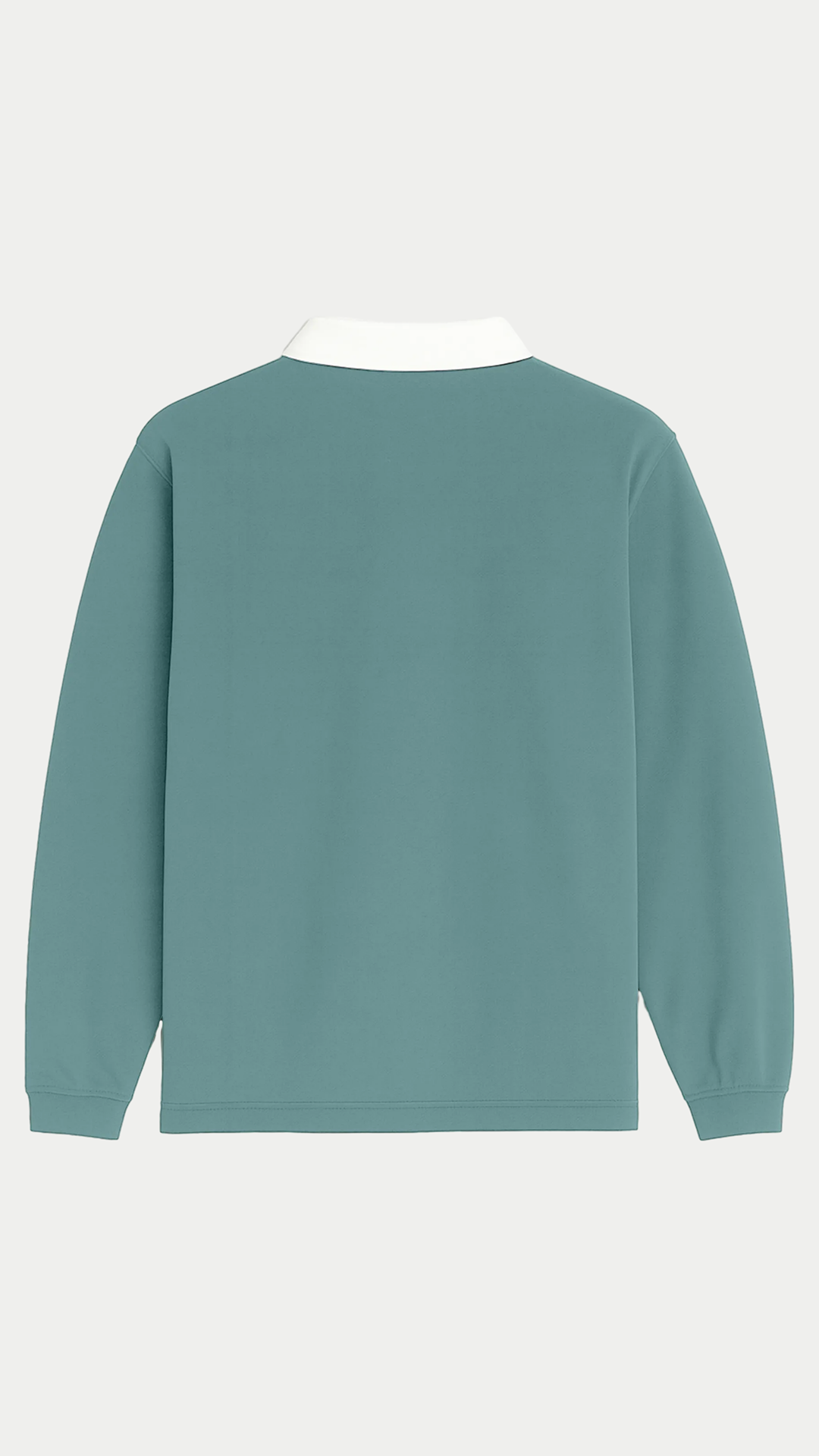 El cuello de punto liso en color blanco junto a la tapeta frontal con tres botones blancos rinde homenaje a la estética clásica del rugby, reinterpretada desde una mirada actual y mediterránea.